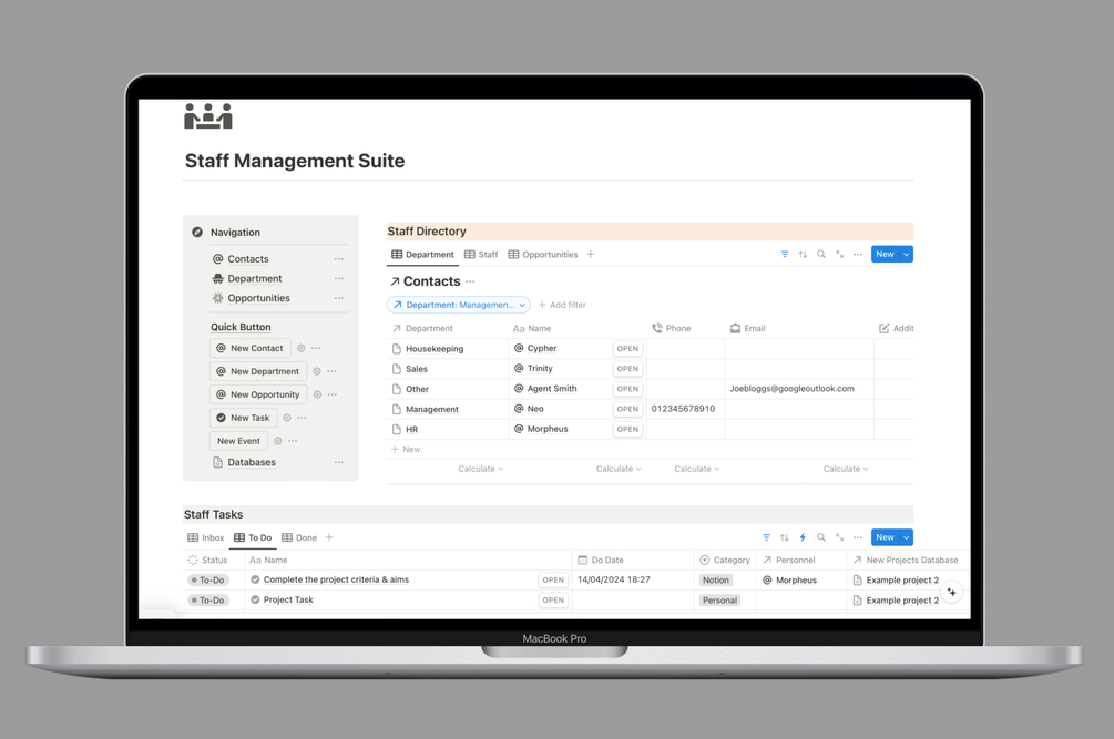 Do you have staff and need to manage them more effectively, keep track of who works in which department / Project or need to recruit new team members? The Staff Management Suite is the template for you. included in this template is the following: